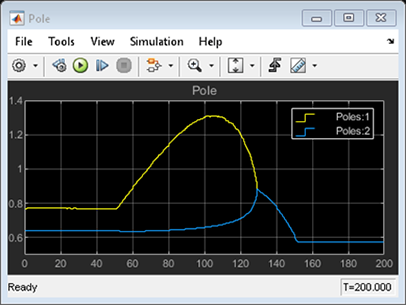 控制器性能根據(jù)設定值跟蹤和干擾抑制進行驗證。反應器濃度CA設定點從原始的8.57(低轉(zhuǎn)化率)過渡到2(高轉(zhuǎn)化率)kmol/m^3。在過渡過程中,反應器首先變得不穩(wěn)定,然后再次穩(wěn)定(見上側(cè)極點圖)。