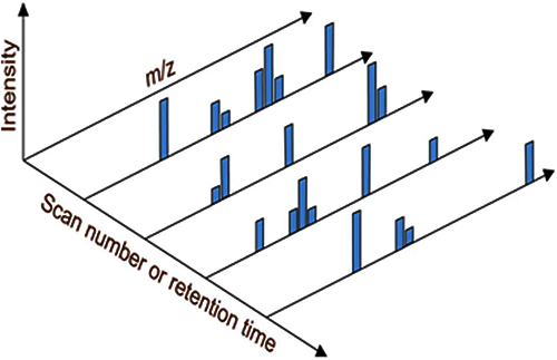 如圖2所示,氣相色譜-質(zhì)譜數(shù)據(jù)是三維的。x軸顯示保留時間;即從樣品注入到氣相色譜運(yùn)行結(jié)束的時間。這也可以看作是掃描次數(shù),即質(zhì)譜儀在整個運(yùn)行過程中獲得的數(shù)據(jù)點的數(shù)量。y軸是離子檢測器測量到的響應(yīng)或強(qiáng)度(圖1(9))。z軸是所獲取的質(zhì)量范圍內(nèi)離子的m/z。