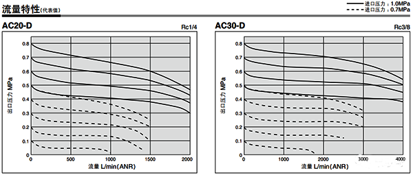 如AC30-D三聯件在進口壓力1MPa,出口壓力在0.7MPa,壓降0.05~0.08MPa的情況下,那么三聯件流量值為1000L/min~2000L/min。