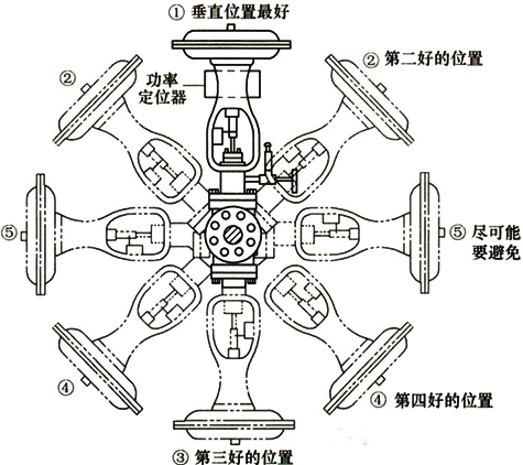 調(diào)節(jié)閥安裝位置比較圖如下圖所示,安裝位置①是最佳安裝位置,即垂直安裝;安裝位置⑤是最差位置,要盡量避免;安裝位置②是次選位置。如果沒(méi)有足夠空間,可選擇位置③和④。