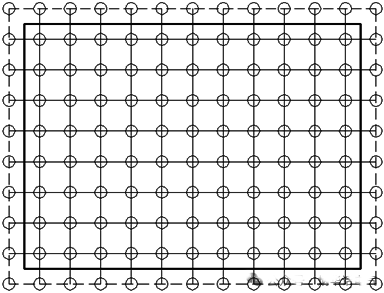 為了得到精確的平均照度值,每個正方形網(wǎng)格中心點的照度值,都應進行計算。如果把所有網(wǎng)格向上或向下移半格,其結(jié)果是相同的,如圖2所示為足球場地的計算網(wǎng)格。在這種情況下,所計算的點為正方形網(wǎng)格的交點,計算結(jié)果與每個構(gòu)成網(wǎng)格都有關(guān)系。由于移動網(wǎng)格而空出的地方,可以將網(wǎng)格沿主網(wǎng)格向外擴展。增加的網(wǎng)格點照度不應計入平均照度的計算之內(nèi)。