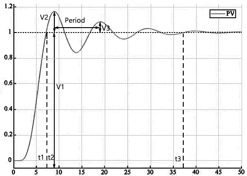 響應(yīng)曲線超出穩(wěn)態(tài)值的最大偏差V2與新穩(wěn)態(tài)值V1之比。超調(diào)量σ用來表征過程變量偏離穩(wěn)態(tài)值的程度,原則上越小越好。由于實際工藝過程一般不允許出現(xiàn)較明顯的超調(diào),因此在控制回路優(yōu)化時,應(yīng)盡量保證過程變量的設(shè)定值階躍變化響應(yīng)為適度超調(diào)或者過阻尼無超調(diào)。