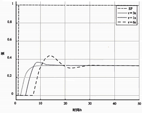 圖2是不同時(shí)間常數(shù)基準(zhǔn)自衡對(duì)象Kc=0.25時(shí)設(shè)定值階躍響應(yīng)??梢园l(fā)現(xiàn):隨著被控對(duì)象時(shí)間常數(shù)的增加,設(shè)定值階躍響應(yīng)越來越緩慢。所以最優(yōu)比例增益應(yīng)該和被控對(duì)象的時(shí)間常數(shù)成正比。被控對(duì)象時(shí)間常數(shù)越大最優(yōu)比例增益應(yīng)該越大,反過來被控對(duì)象時(shí)間常數(shù)越小最優(yōu)比例增益應(yīng)該越小。