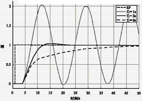 可以保證設(shè)定值階躍響應(yīng)有超調(diào)無振蕩。通過多次的設(shè)定值階躍響應(yīng)可以得到和前面一樣的結(jié)論:純比例控制器總是有余差。為了消除余差,可以使用比例積分控制器。積分作用通過對偏差的累積消除余差,偏差累積的速度應(yīng)該和被控對象的動(dòng)態(tài)特性時(shí)間常數(shù)相匹配。我們使用基準(zhǔn)模型、Kc=0.25和不同積分時(shí)間進(jìn)行閉環(huán)設(shè)定值階躍測試。設(shè)定值階躍響應(yīng)曲線如圖1所示。當(dāng)積分時(shí)間太小(積分作用太強(qiáng))時(shí),設(shè)定值階躍響應(yīng)會(huì)超調(diào)甚至振蕩。當(dāng)積分時(shí)間太大(積分作用太弱)時(shí),設(shè)定值階躍響應(yīng)緩慢,表現(xiàn)為“拖尾”現(xiàn)象。合適的積分時(shí)間應(yīng)和被控對象的時(shí)間常數(shù)匹配。