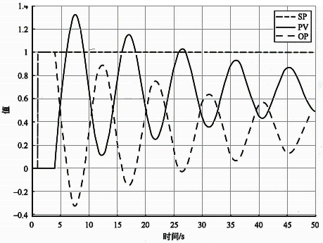 如圖1所示,如果PID控制器輸出和過程變量同時(shí)達(dá)到極值(波峰或波谷),即兩者同相位振蕩,通常是由比例增益過強(qiáng)引起的。比例作用太強(qiáng)引起的振蕩可以總結(jié)為:
