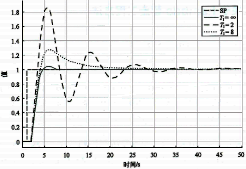 不同積分時間的設(shè)定值階躍響應(yīng)如圖5所示。可以看出:純比例不振蕩,積分作用太強(qiáng)了引起振蕩,積分作用弱了消除余差比較慢,增強(qiáng)積分作用閉環(huán)響應(yīng)超調(diào)更嚴(yán)重,更容易振蕩。增加積分作用后過程變量的超調(diào)量明顯增加,這是由積分對象的積分作用和比例積分控制器的積分作用的雙重作用造成的。最佳的積分時間能最快速消除余差而且還不會引起振蕩。
