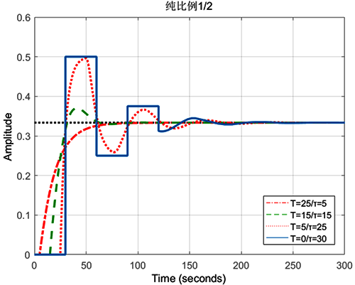 在一個由增益K、時間常數(shù)T和純滯后時間τ確定的一階純滯后過程中,獲得等幅振蕩的純比例與增益K成反比,與T/τ成正比。如下圖所示,同樣的純比例1/2,隨著T/τ從5到0閉環(huán)響應從無超調,到有超調不振蕩再到衰減振蕩。