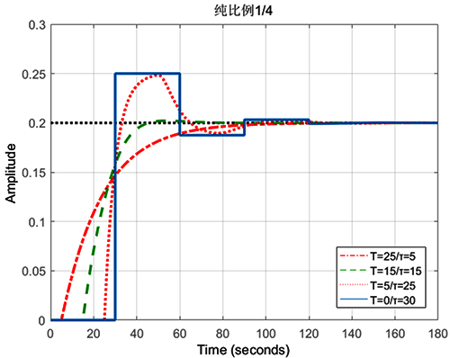 如果希望所有的一階純滯后自衡對象都1/4衰減振蕩,則工程上的比例邊界就可以利用ZN法砍一半設置為1/2K。在現(xiàn)代整定方法中都追求有超調無振蕩,則工程上的比例增益邊界可以繼續(xù)砍一半為1/4K。這個比例增益既是所有一階純滯后自衡對象的比例邊界,也是一個適用于所有一階純滯后自衡對象的通解。通解對不同T/τ的響應如下圖。
