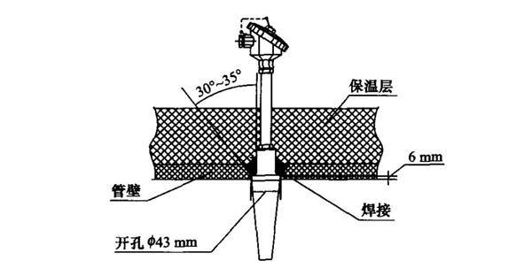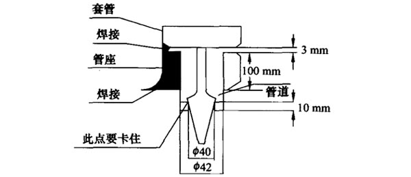 下圖為熱套式管座焊接方式,先在管道上開(kāi)一個(gè)640mm的孔,然后在管道壁上焊一個(gè)8.9mm×23.5mm的管座,再將熱電偶插入管座內(nèi),將熱套式熱電偶套管與管座焊在一起。這種焊接方式適用于熱套式熱電偶,它對(duì)管座制作及熱電偶焊接過(guò)程要求非常嚴(yán)格,必須同時(shí)滿足下列條件: