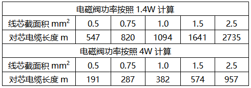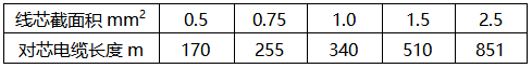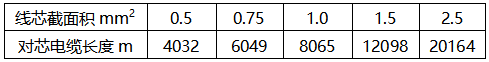 結(jié)合線芯截面積選用原則c的要求,截面積與敷設(shè)長度的選用推薦值如下表。