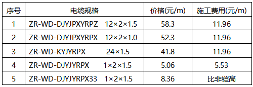 從下表中可以得出,如果主電纜線徑由目前的1.5降低為1.0mm2,每米主電纜可節(jié)省16元,分支電纜由鎧裝修改為非鎧裝,每米電纜的費(fèi)用至少可降3.5元。