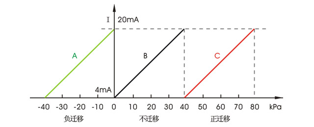 變送器的測(cè)量范圍等于量程和遷移量之和,即測(cè)量范圍=量程范圍+遷移量。如圖所示,圖中A量程為40kPa,遷移量為-40kPa,測(cè)量范圍為-40~0kPa;B量程為40kPa,無(wú)遷移量,測(cè)量范圍為0-40kPa;C量程為40kPa,遷移量為40kPa,測(cè)量范圍為40-80kPa。