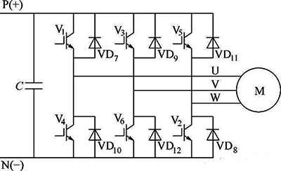變頻器的IGBT是單向元件,只能單向?qū)?,為了給電機(jī)與電源提供一個(gè)反饋通路,故在每只IGBT上反并了一個(gè)二極管,只不過,反饋的電能用于對(duì)電容充電。如下圖: