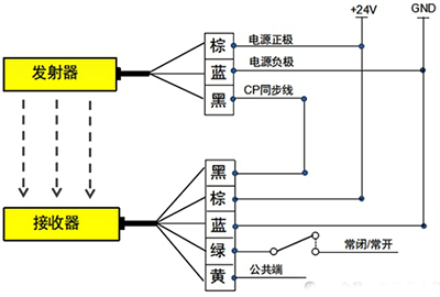 在接線的過程中,我們會發(fā)現(xiàn)很多安全光幕有同步線,這種一般就是線同步。