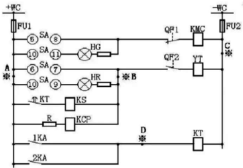 再比如B、C兩點(diǎn)接地,開關(guān)合閘后,輔助開關(guān)閉合,B、C兩點(diǎn)均接電源負(fù),此時,B、C兩點(diǎn)將被短接,短掉了分閘線圈,若發(fā)生保護(hù)動作,也不會動作,造成保護(hù)拒動。
