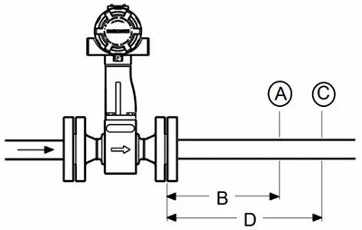 工藝管線的設計應保證渦街流量計本體始終充滿過程流體,渦街流量計本體的上游和下游側(cè)應有足夠長度的直管段,應把閥門安裝在渦街流量計的下游。