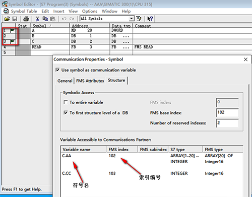 那我們先了解一下PROFIBUS-FMS通信服務(wù)是怎么實現(xiàn)的。FMS是采用主從方式,主站通過“讀”、“寫”指令與從站進行數(shù)據(jù)交換,由于各廠家地址區(qū)定義的差異性,例如西門子有DB、M、I、Q等地址區(qū),但是別人家不一定是這樣呀,那就采用符號名的方式,給PLC變量命名一個符號名稱,或者采用INDEX方式,給變量一個編號,例如101、102等。S7-300/400被讀寫的變量需要在符號表中一一定義。