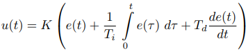 其中,u(t)是控制器輸出,e(t)是控制誤差,即設(shè)定值r與過程輸出y之間的差異。控制參數(shù)分別是比例增益K、積分時(shí)間常數(shù)Ti和微分時(shí)間常數(shù)Td。這種控制結(jié)構(gòu)被稱為線性或標(biāo)準(zhǔn)PID形式,但并行和交互形式也可以考慮(?str?m和H?gglund,2006)。