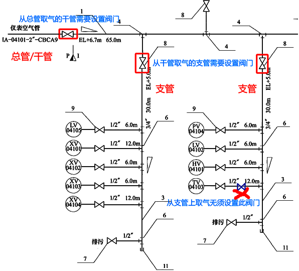2)上圖出自HG/T20638中儀表空氣管道系統圖,也可以參考SHT3521中11.1.4