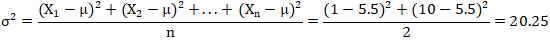 我們還是用上面的1和10兩個數(shù)字,總體平均值μ=5.5的簡單例子,來看總體方差公式如何使用。