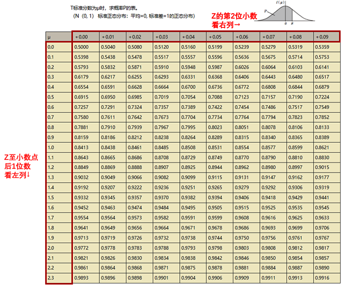 這個表是前人整理好的數(shù)據(jù),用起來也很方便。首先,我們要看最左手列,去查閱Z至小數(shù)點后1位數(shù),之后,我們再查最上一行,看Z的第二位小數(shù),左右交叉得到的數(shù),就是我們需要找的數(shù)。