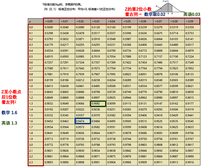 放到小A的例子中,數(shù)學的標準差為1.625、英語的標準差為1.333。我們來試試查這個表。以數(shù)學為例,先看最左列,Z至小數(shù)點后1位數(shù)為1.6,接著,再看最上行,Z的第2位小數(shù)我取0.02,交叉得到的數(shù)就是0.9474(藍色方框中的數(shù))。英語的查閱方式同理,取值為0.9082。