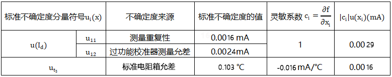 (6)由溫度變送器的輸出電流的測量重復性和多功能校準儀的測量誤差引起的不確定度分量u(Id)