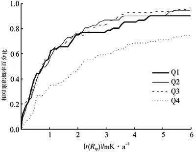 為了提供更多的定量支持以證明這個(gè)論點(diǎn),根據(jù)r(WZn)值將樣本分為四組。第一組(Q1)包括所有|r(WZn)|小于等于第一個(gè)四分位數(shù)的樣本[|r(WZn)|≤0.25mK/a],見(jiàn)表2。第二組(Q2)包括所有|r(WZn)|大于第一個(gè)四分位數(shù)且小于等于第二個(gè)四分位數(shù)的樣本[0.25mK/a<|r(WZn)|≤0.78mK/a]。類(lèi)似的定義用于定義第三和第四組樣本(Q3和Q4)。在四組樣本中分析|r(Rtp)|,并繪制類(lèi)似于圖2的累積概率百分比圖7,圖中包含了4組累積概率。從圖7可以看出,有相當(dāng)一部分?jǐn)?shù)量的樣本的|r(WZn)|偏大(Q3和Q4),而其|r(Rtp)|很小。在Q3中有1/3的樣本,其|r(Rtp)|小于0.5mK/a,而這樣的樣本在Q4中占比為1/4,這些樣本的|r(WZn)|都高于0.78mK/a。此外,Q1、Q2和Q3的累積概率百分比圖中曲線走向趨勢(shì)非常相似,這說(shuō)明使用測(cè)量Rtp來(lái)評(píng)估WZn(或Wx)是否有變化是不可靠的,可以使用Rtp變化作為可能性指標(biāo),而不能過(guò)分依賴(lài)。