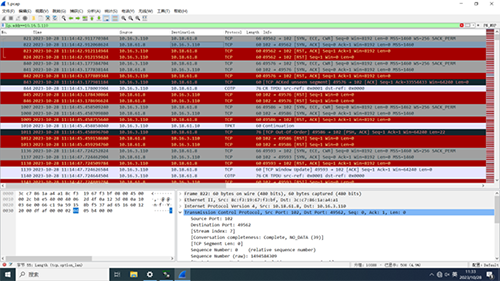 接著是843號報文,該報文的長度是60個字節(jié),與MES側(cè)的17591號報文對應,因為MES側(cè)是在本機抓包,出口的報文54會被填充最小長度的以太網(wǎng)報文,于是在843出現(xiàn)了60個字節(jié)的長度應答。