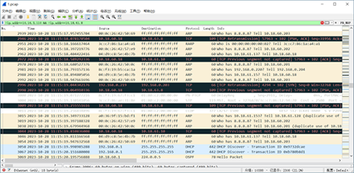 基于這樣的疑問,使用!ip.addr==10.16.3.110 &&!ip.addr==10.18.61.8過濾規(guī)則,查看其它的不屬于該終端的IP地址,發(fā)現(xiàn)了有些不屬于該終端的一些報文,黑色標識。特殊的是10.18.63.8這個IP地址并不存在于現(xiàn)場的設備中,但是報文中的MAC地址與192.168.61.8的MAC地址也相同。
