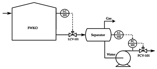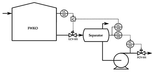 分離器液位控制由進(jìn)口流量控制閥LCV-01控制,F(xiàn)WKO罐液位由泵排出處的控制閥(LCV-02)控制。這種嵌套控制方案是一種更清晰、更可靠的設(shè)計(jì),提供了更好的總體性能。其實(shí)還有更簡單的處理辦法,解決控制問題并不一定要重新設(shè)計(jì)控制方案。