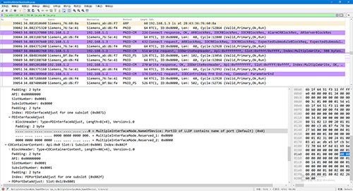 進一步探究發(fā)現(xiàn),控制器發(fā)送Read.Req給智能設備以獲取詳細診斷信息,最終確定故障為擴展通道的診斷,即ExtChannelDiagnosis(0x8002),錯誤類型為“Multiple interface mismatch”。這也與控制器診斷緩沖區(qū)中的提示Multi-interface mismatch-inconsistent parameterization for sending LLDP data”一致。