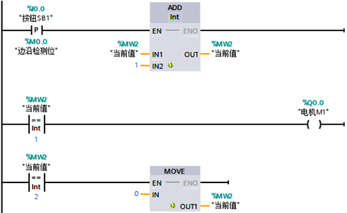 按下按鈕SB1(I0.0),當(dāng)前值(MW2,初始值為0)加1,判斷當(dāng)前值不等于0成立,Q0.0置位,電機(jī)MI啟動。