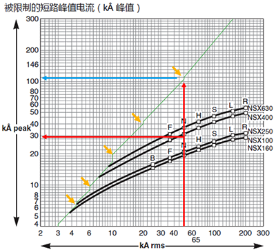 下圖為NSX400斷路器的允通電流曲線(限流曲線),當(dāng)預(yù)期短路電流為50kA時(shí),經(jīng)過(guò)NSX400限流后的短路電流峰值為30kA。