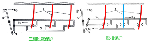 以GV2熱磁式電動(dòng)機(jī)保護(hù)斷路器為例,能實(shí)現(xiàn)缺相保護(hù)是由于內(nèi)部有差動(dòng)機(jī)構(gòu)(圖6)。