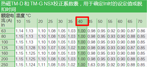 圖9 熱磁式NSX塑殼斷路器溫度降容表(部分)