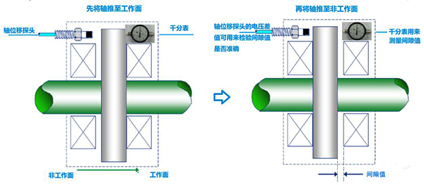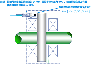 3、保持軸頂在非工作面上,假設(shè)3500軸位移通道設(shè)置零位電壓為-10V,(使用3300XL 8mm系列電渦流傳感器進(jìn)行測(cè)量)則軸位移傳感器安裝電壓應(yīng)該是用零位電壓減去剛剛推軸測(cè)量出的間隙值所對(duì)應(yīng)的電壓的一半。其計(jì)算公式為:傳感器安裝電壓V=-[10-(D/2)×7.87],其中7.87V/mm為8mm電渦流傳感器靈敏度。這樣當(dāng)軸回到中心點(diǎn)后,軸位移傳感器電壓即應(yīng)該為-10V。其他不同的零點(diǎn)位置設(shè)計(jì)可據(jù)此類推,改變計(jì)算方法即可。