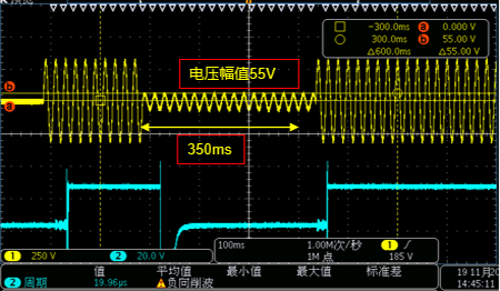 我們選擇的是一款寬電壓電子線圈接觸器,其線圈電壓范圍為100V~250VAC/DC,首先通電AC220V(幅值315V)讓接觸器吸合,通電時間200ms,此時接觸器已經(jīng)吸合穩(wěn)定,見圖7,黃線代表線圈電壓,藍線代表主觸頭信號。