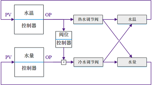 閥位控制器當(dāng)檢測到水溫控制器輸出,處于較高閥位有失控風(fēng)險(xiǎn)時(shí),會(huì)減少PID控制器輸出并通過低選超馳控制關(guān)小冷水調(diào)節(jié)閥,從而放棄水量控制保證水溫控制。這個(gè)方案有兩個(gè)問題:①熱水閥不能全開,極致性能沒有達(dá)到;②閥位控制調(diào)節(jié)緩慢,動(dòng)態(tài)性能可能略差。