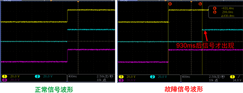 昌暉儀表曾經(jīng)處理過多起類似故障,以某現(xiàn)場電梯控制系統(tǒng)丟失信號為例,示波器抓取的電壓信號顯示,觸頭導通信號延遲930ms后再出現(xiàn),這早就超過了系統(tǒng)設(shè)定的檢測時間,所以會經(jīng)常報錯。