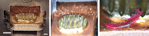 輔助觸點導通可靠性故障一般會出現(xiàn)在設(shè)備調(diào)試階段或設(shè)備運行一段時間后,調(diào)試階段的故障原因基本上是觸點污染物引起,例如粉塵、外來異物等(見下圖)。