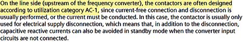 所以,在西門(mén)子技術(shù)文件《Industrial Controls System Manual》中,對(duì)于變頻器前端的進(jìn)線接觸器K1(圖7),也推薦采用AC-1使用類(lèi)別選型(圖6)。