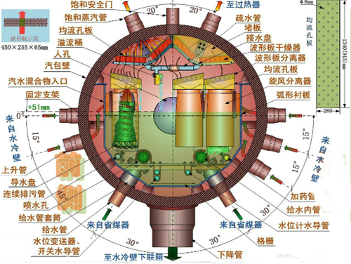 沿汽包長度在兩側(cè)裝設(shè)若干旋風(fēng)分離器,每個旋風(fēng)分離器筒體頂部配置有百頁窗(波形板)分離器,它們的主要作用是將由上升管引入的汽水混合物進行汽和水的初步分離。在汽包的中上部,水平裝沒蒸汽清洗孔板,其上有清潔給水層,當蒸汽穿過水層時,便將溶于蒸汽或攜帶的部分鹽分轉(zhuǎn)溶于水中,以降低蒸汽的含鹽??拷捻敳吭O(shè)有多孔板,均勻汽包上升蒸汽流,并將蒸汽中的水分進一步分離出來。汽包中心線以下150mm左右設(shè)有事故放水管口;正常水位線下約200mm處設(shè)有連續(xù)排污管口,再下面布置加藥管。下降管入口處還裝設(shè)了十字擋板.以防止下降管口產(chǎn)生漩渦斗造成下降管帶汽。