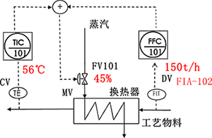 在如下圖所示的換熱器出口溫度控制中,工藝物料為150t/h,蒸汽閥位45%,則前饋系數(shù)FFC101=MV/DV=45/150=0.3,因?yàn)槭钦嚓P(guān),所以就是0.3。這種用絕對(duì)量計(jì)算本質(zhì)增量的前饋系數(shù)的方法,并不能總是奏效,要注意適用范圍;