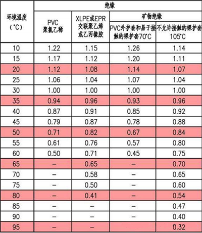 ◆環(huán)境空氣溫度不同于30℃時的校正系數(用于敷設在空氣中的電纜載流量)