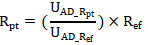 ,式中G為ADS122X內(nèi)部增益倍數(shù),可通過程序選擇倍數(shù)大?。籊×UAD_Rpt為URpt經(jīng)模數(shù)轉(zhuǎn)換后對應(yīng)的電壓值;G×UAD_Ref為URef經(jīng)模數(shù)轉(zhuǎn)換后對應(yīng)的電壓值;△U0為ADS1248內(nèi)部零點(diǎn)漂移誤差,可通過校準(zhǔn)消除。