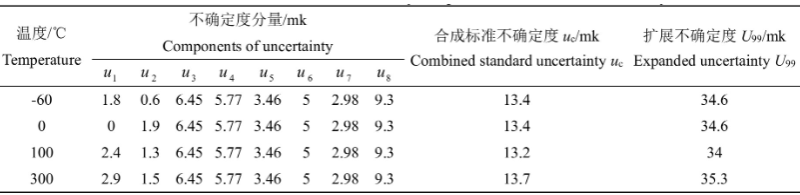置信概率取p=99%,k=2.58,將各檢定點(diǎn)標(biāo)準(zhǔn)不確定度依次帶入式13,得到精密鉑電阻溫度計(jì)在檢定點(diǎn)的擴(kuò)展不確定度U99。