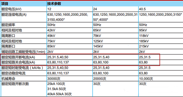 如下圖所示,為某知名品牌的真空斷路器部分技術(shù)參數(shù),圖中紅色框內(nèi)的額定短路關(guān)合電流與額定短路開(kāi)斷電流之比為2.5,該比值對(duì)12kV、24kV、40.5kV均有效。