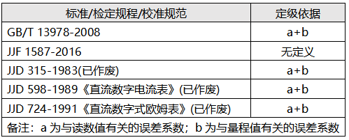 根據(jù)JJF 1587-2016,現(xiàn)在已使用最大允許誤差替代準(zhǔn)確度等級用于表達(dá)數(shù)字多用表技術(shù)性能。但GB/T 13978-2008《數(shù)字多用表》之5.14.3給出:以規(guī)定基本測量不確定度的系數(shù)a和b之和作為等級指標(biāo)。已作廢的JJG 315-1983《直流數(shù)字電壓表》之6.2、6.3給出:準(zhǔn)確度等級以基本量程誤差系數(shù)(a+b)的大小和年穩(wěn)定誤差來劃分。各標(biāo)準(zhǔn)對數(shù)字表等級定義主要依據(jù)如表1所示。