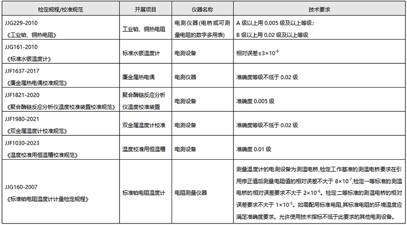 本文以直流電阻信號為例,介紹熱學(xué)計量中常見項目電測儀表的基本情況。標(biāo)準(zhǔn)鉑電阻溫度計是-196℃~660℃溫度范圍內(nèi)常用的標(biāo)準(zhǔn)器具,是開展工業(yè)鉑、銅熱電阻溫度計檢定、標(biāo)準(zhǔn)水銀溫度計檢定、溫度變送器校準(zhǔn)、精密測溫的主標(biāo)準(zhǔn)器。用標(biāo)準(zhǔn)鉑電阻溫度計作為主標(biāo)準(zhǔn)器開展量值傳遞時,需配接電測設(shè)備用于測量其電阻值。常見檢定規(guī)程/標(biāo)準(zhǔn)規(guī)范中對電測設(shè)備的要求如表2所示。